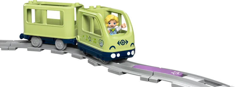 De 3 actiestenen brengen het spel tot leven en laten de speelgoedtrein realistische geluiden maken als hij eroverheen rijdt. Peuters kunnen de speciale aanpassingssteen gebruiken om hun eigen geluiden af te spelen die zijn opgenomen met de gratis LEGO® DUPLO® Interactieve Treinen app. Deze app kan ook worden gebruikt om de trein te besturen met een draagbaar elektronisch apparaat.
