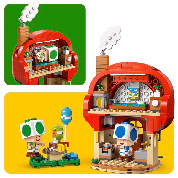 Deze set bevat een gedetailleerd Toad-huisje met een keuken en slaapkamer, inclusief een schilderij van Peach’ kasteel en uitneembare meubels voor eenvoudig speelplezier. Buiten vind je een picknicktafel voor de blauwe en groene Toad, een bouwbare grammofoon en feestaccessoires. De set bevat minifiguren van zowel de blauwe als de groene Toad. De bouwinstructies zijn inbegrepen in de doos en beschikbaar in de LEGO Super Mario app. Het Toad-huisje bestaat uit 276 onderdelen en is ongeveer 18 cm hoog, 12 cm breed en 12 cm diep.