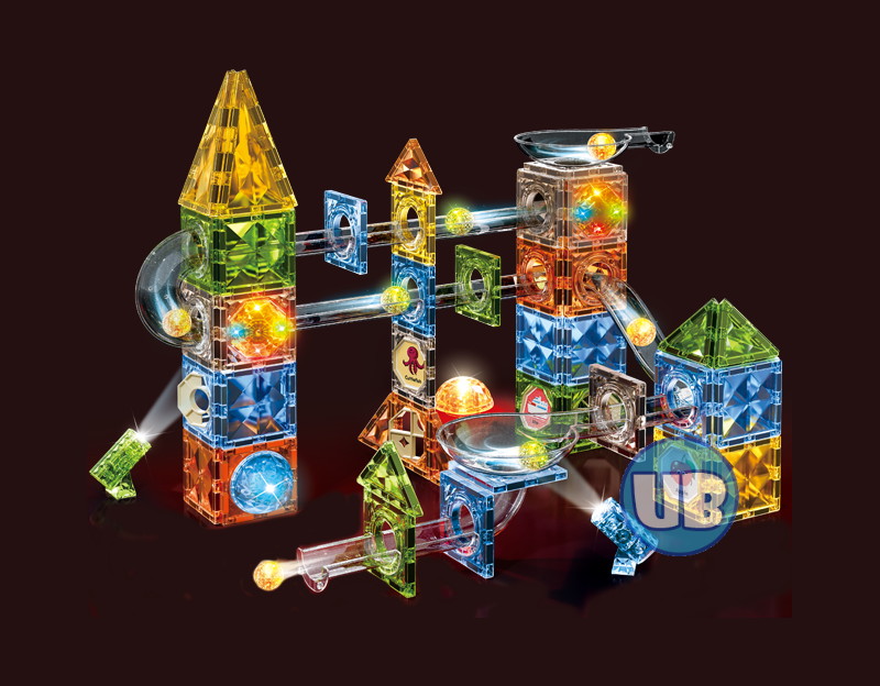 De set bevat kleurrijke magnetische tegels die gemakkelijk aan elkaar klikken, stevige knikkerbaandelen, een lichtelement en discobal voor extra speelplezier in het donker, en natuurlijk de knikkers om de baan tot leven te brengen. Kinderen kunnen hun eigen banen ontwerpen en blijven steeds nieuwe vormen en uitdagingen bedenken.
